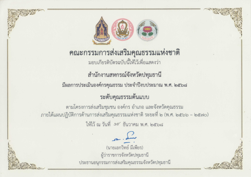 สำนักงานสหกรณ์จังหวัดปทุมธานี ได้รับ เกียรติบัตร เพื่อแสดงว่า มีผลการประเมินองค์กรคุณธรรม ประจำปีงบประมาณ พ.ศ. 2568 อยู่ในระดับ คุณธรรมต้นแบบ ตามโครงการส่งเสริมชุมชน องค์กร อำเภอ และจังหวัดคุณธรรม ภายใต้แผนปฏิบัติการด้านการส่งเสริมคุณธรรมแห่งชาติ ระยะที่ 2 (พ.ศ. 2566 – 2570) ซึ่งเป็นอีกหนึ่งความภาคภูมิใจที่สะท้อนถึงความมุ่งมั่นของหน่วยงานในการพัฒนาองค์กรอย่างมีคุณธรรมและยั่งยืน ภายใต้การนำทีมโดยนางสุชาดา เคนพิทักษ์ สหกรณ์จังหวัดปทุมธานี